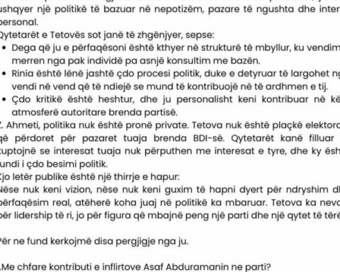 Një letër publike është dërguar degës së BDI-së Tetovë, nga një grup aktivistësh të kësaj partie, ku është shprehur zhgënjimi nga kjo degë, posaçërisht nga puna e Faton Ahmetit. Ja dhe letra