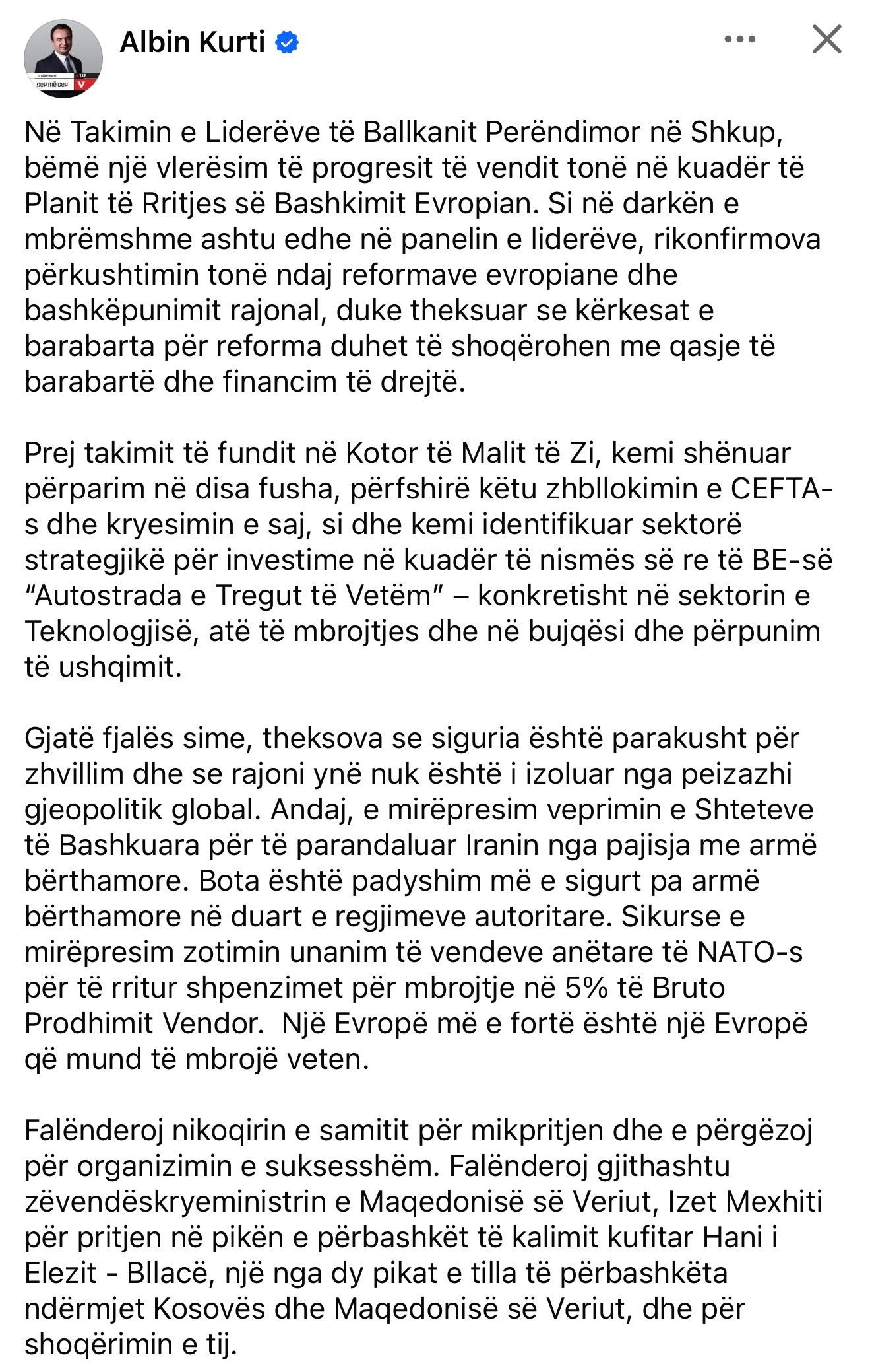 Në Takimin e Liderëve të Ballkanit Perëndimor në Shkup, Kryeministri i Kosovës, Albin Kurti, ka falënderuar nikoqirin e samitit për mikpritjen dhe e ka përgëzuar për organizimin e suksesshëm, duke shprehur gjithashtu mirënjohje për zëvendëskryeministrin e Maqedonisë së Veriut, Izet Mexhiti, për pritjen në pikën e përbashkët të kalimit kufitar Hani i Elezit – Bllacë, një nga dy pikat e tilla të përbashkëta ndërmjet Kosovës dhe Maqedonisë së Veriut, si dhe për shoqërimin e tij.